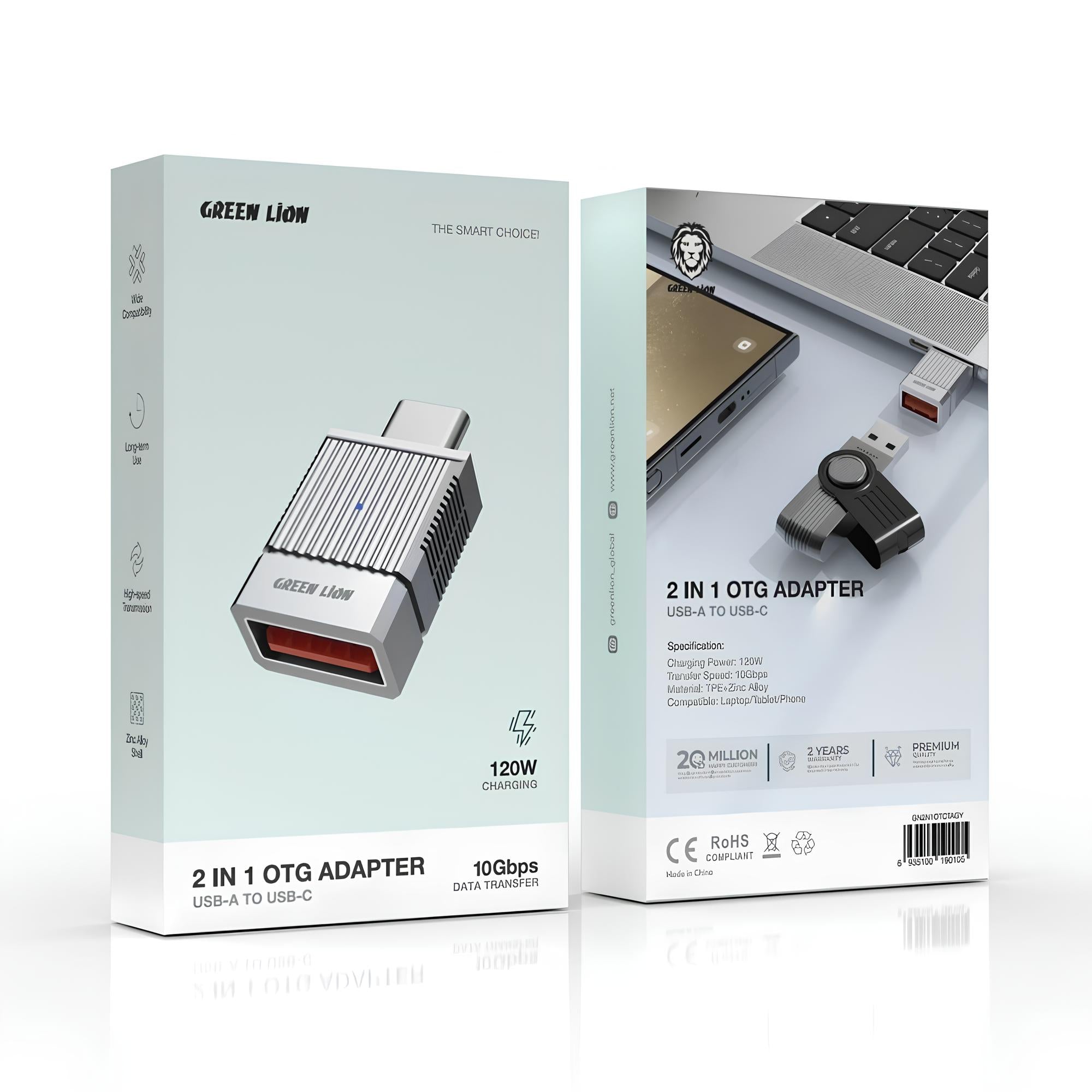 Green Lion 2-in-1 OTG 3.0 Adapter | USB-A to USB-C | 10Gbps Speed | 120W Power Delivery – Gray