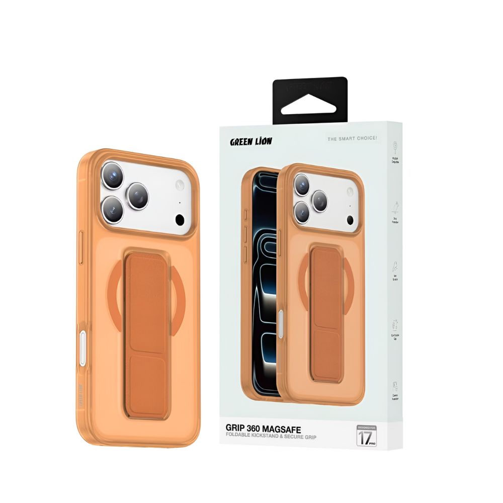 The Green Lion GRIP 360° MagSafe Case for iPhone 17 Pro combines military-grade protection with a sleek stylish design, modern look. Designed for both style and performance, this case offers 360° functionality with horizontal and vertical support, making it ideal for everyday use, work, and entertainment. Built with strong MagSafe magnets, it ensures a secure attachment for wireless chargers and accessories. With impact resistance up to 3500Gs, your iPhone stays protected from drops and shocks. The premium leather grip strap enhances comfort and control, while the foldable stand allows hands-free viewing anytime, anywhere.