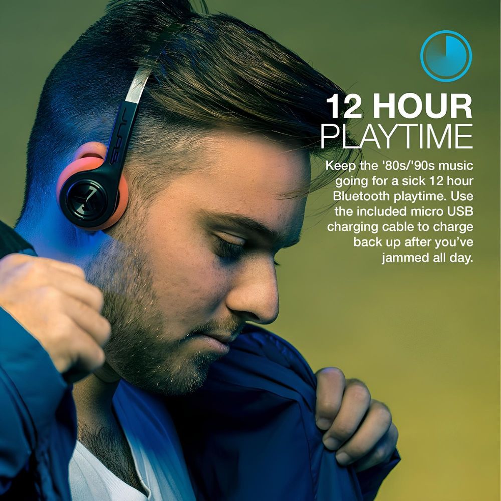 Classic 80s-inspired design with colorful foam ear cushions – a nostalgic look with today's wireless convenience.