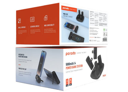 Porodo 4in1 Charging Station – Portable Hub with LED Display, 20W Output, Lightning & Type-C Connectors, Integrated Kickstand, and 5000mAh Battery