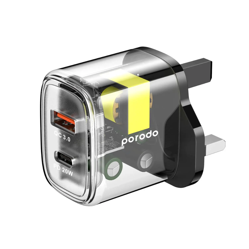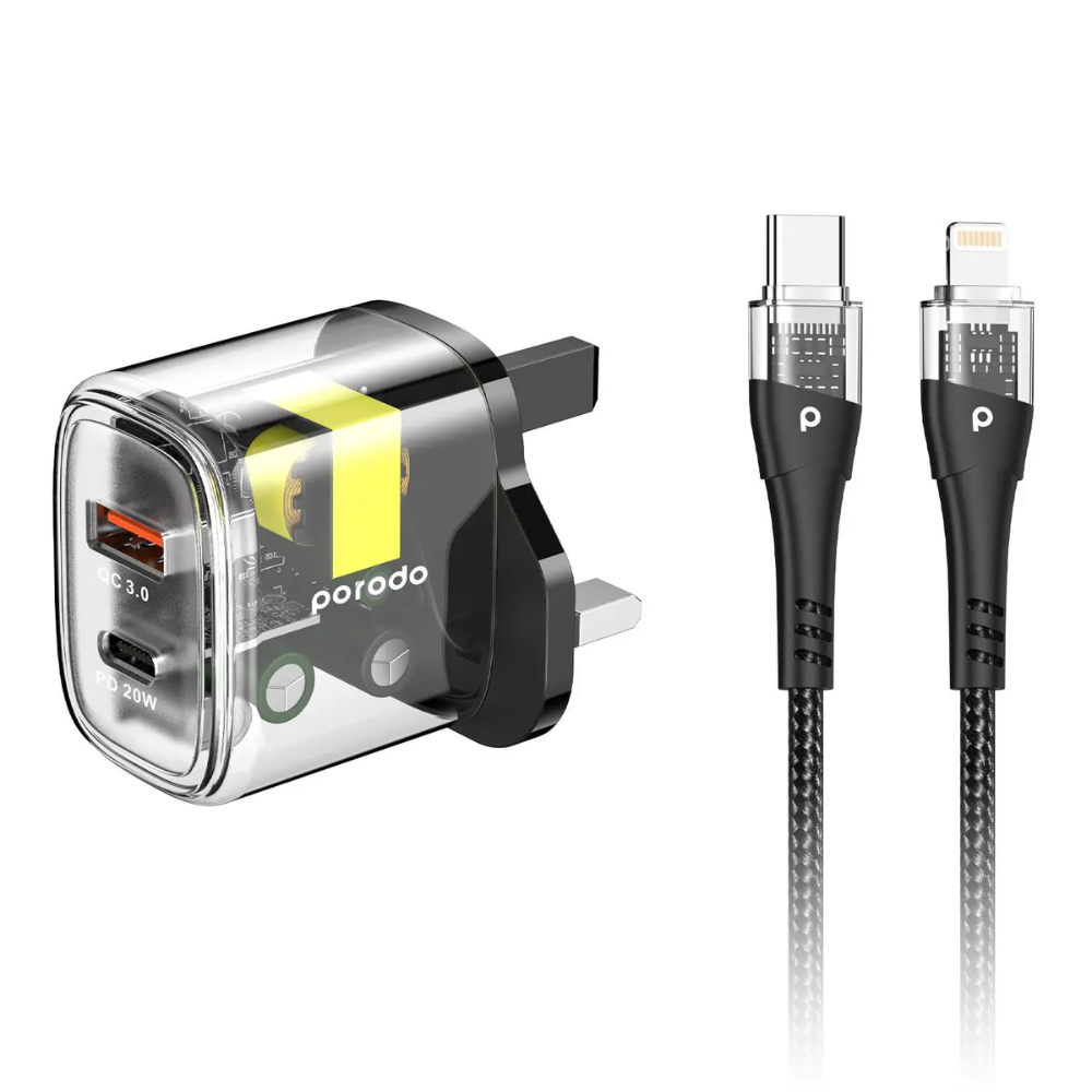 Porodo Dual Output Transparent Quick Charger PD 20W + QC 18W UK with USB-C to Lightning Cable 1.2M