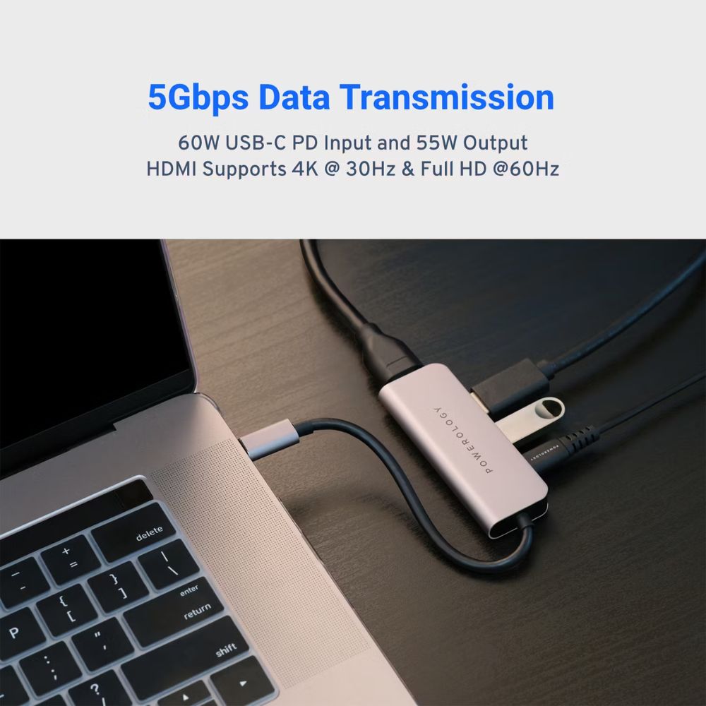 Powerology 4-in-1 USB-C Hub with 60W PD, 4K HDMI, and USB 3.0 Ports - Aluminum Body for MacBook Pro, Dell... Read more
