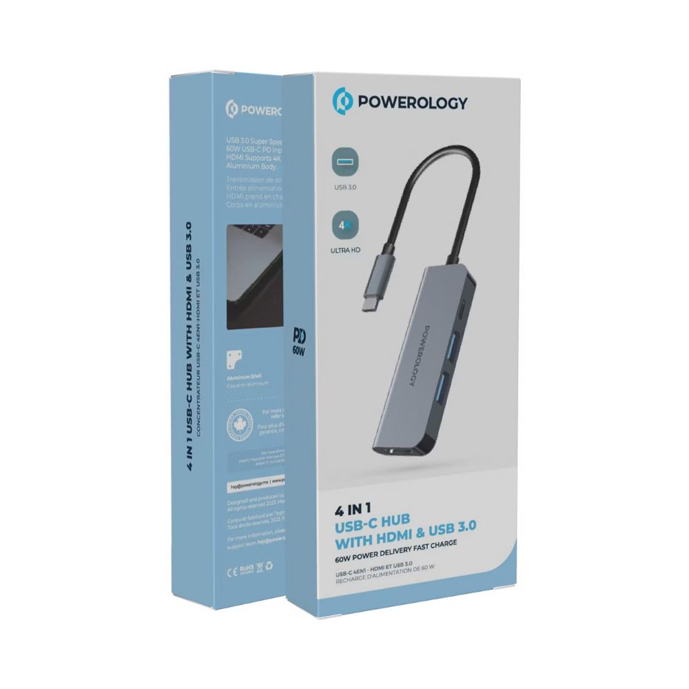 Powerology 4-in-1 USB-C Hub with 60W PD, 4K HDMI, and USB 3.0 Ports - Aluminum Body for MacBook Pro, Dell XPS, Microsoft Surface Book, and More