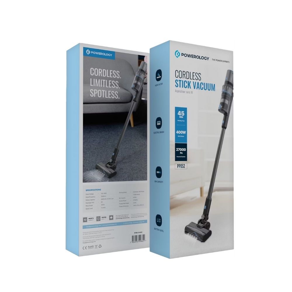 The Powerology Cordless Stick Vacuum is a powerful and convenient cleaning solution designed for modern homes. Equipped with a high-performance 400W motor and an impressive 27,000Pa suction power, it effortlessly removes dust, dirt, and debris from floors, carpets, and hard-to-reach areas. Its cordless design and lightweight build make daily cleaning faster, easier, and more comfortable.
