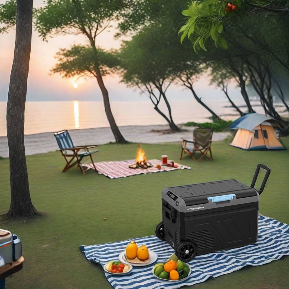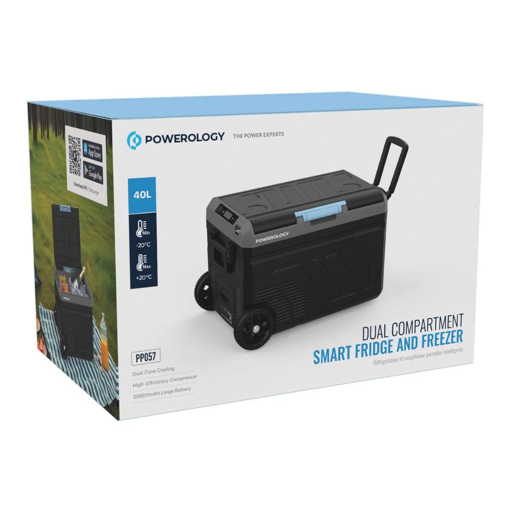 Stay cool anywhere with the Powerology Portable Fridge 40L. Dual compartments, -22°C to +24°C range, 20,800mAh battery, and trolley design—perfect for travel, camping, and road trips.
