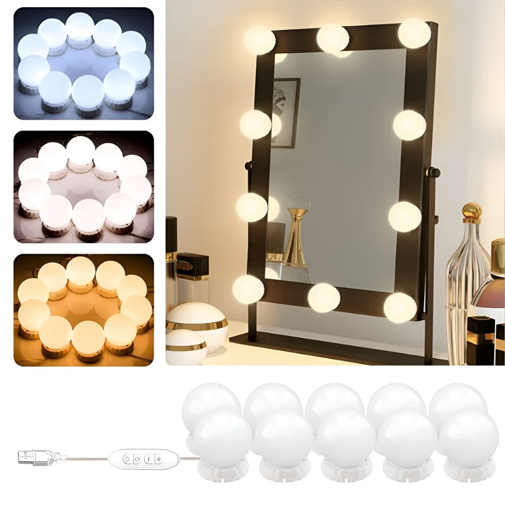 Enhance your makeup routine with Vanity Mirror LED Lights and turn any mirror into a professional makeup station. Designed to deliver soft, natural, and bright illumination, these lights ensure even coverage without glare or heat—perfect for flawless makeup application anytime. Featuring 3 adjustable color modes, you can switch between warm, natural, and cool lighting to match different environments and makeup needs. The flexible cable allows you to customize bulb spacing to fit mirrors of any size. With strong adhesive backing, installation is quick and hassle-free—no drilling required.
